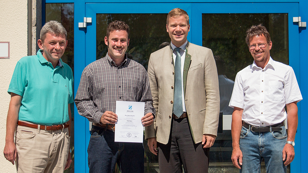 Bezirkstagspräsident Dr. Olaf Heinrich gratulierte Daniel Drexler zur bestandenen Abschlussprüfung zum Gärtner der Fachrichtung Obstbau und wünschte ihm viel Erfolg für seine berufliche Zukunft. Martin Scholz, Verwaltungsleiter des Agrarbildungszentrums Landshut-Schönbrunn, schloss sich den Glückwünschen an.
