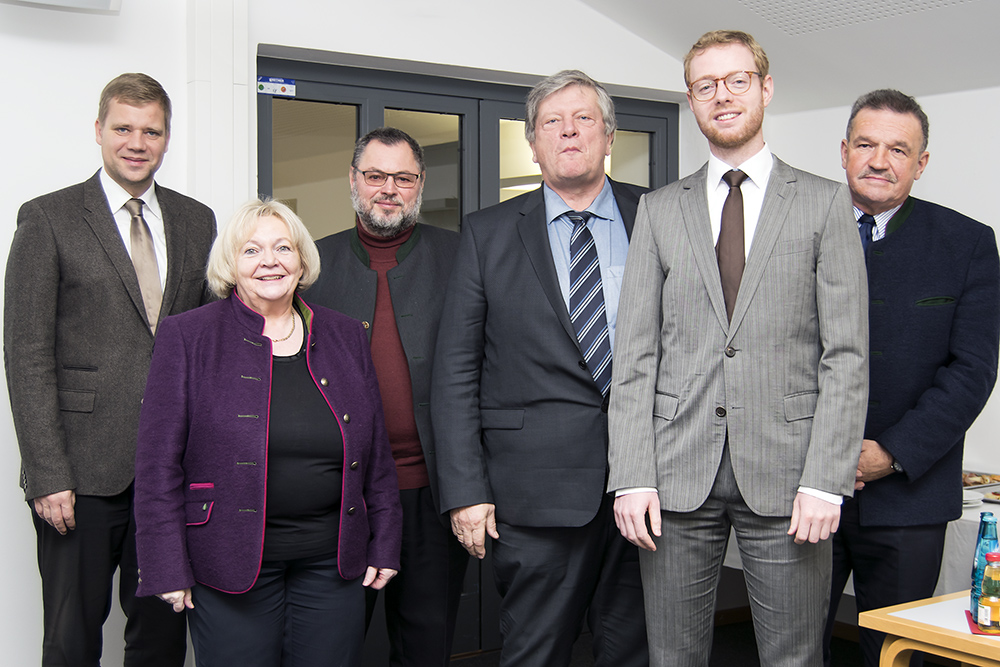 Bildunterschrift: Bezirkstagspräsident Dr. Olaf Heinrich (li.), Bürgermeister Jürgen Fundke (re.) sowie stellvertretender Landrat Klaus Jeggle (3. v. re.) mit den neuen Verbandsräten Margret Tuchen, Anton Maller und Kai Hofmann (2. v. re.).