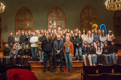 Gratulierten zu 20 Jahre Schulpartnerschaft: Oberbürgermeister Alexander Putz (vorne Mitte), Bezirksrat Markus Scheuermann (rechts daneben), Sylva Daizis (2. Reihe ganz rechts)