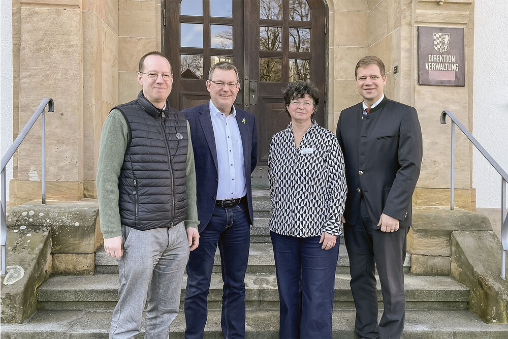 Bezirkstagspräsident Dr. Olaf Heinrich im Gespräch mit dem ärztlichem Direktor Prof. Johannes Hamann (v.l.), Klinikdirektor Uwe Böttcher und Pflegedirektorin Agnes Kolbeck.