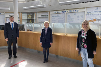 Bildunterschrift: Sehen die Rottal Terme Bad Birnbach bereit für die Wiedereröffnung: Bezirkstagspräsident Dr. Olaf Heinrich, Werkleiterin Josefine Kohlmeier und Bürgermeisterin Dagmar Feicht (v. l. n. r.). Foto: Bezirk Niederbayern